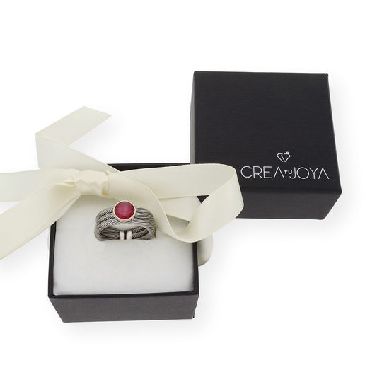 Anillo Acero con Piedra de Color Roja y Filo en Oro de ley 18k