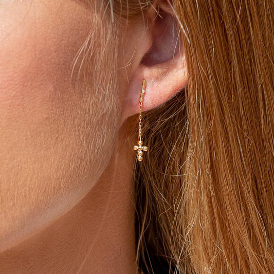 Pendientes Largos y Diseño de Cruz en Oro 18k