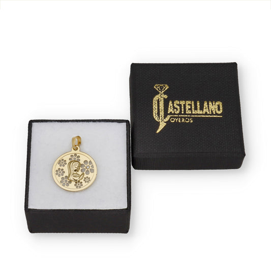 Medalla Virgen NIña en Oro 18K con Circonita y Margaritas Caladas