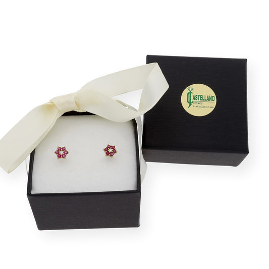 Pendientes de Flor en Oro de Ley 18K con Rubíes y Diamante central