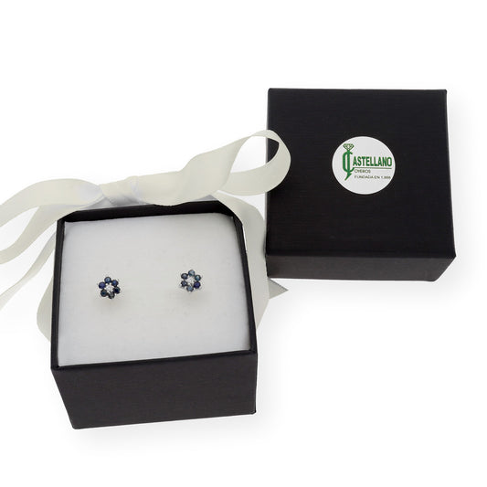 Pendientes de Flor en Oro Blanco de Ley 18K con Zafiros y Diamante central