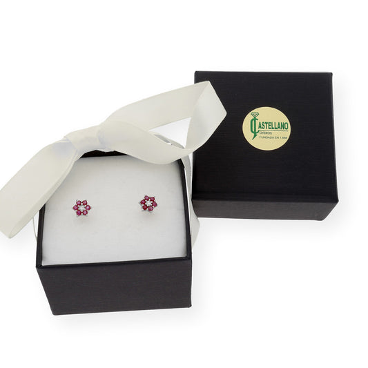 Pendientes de Flor en Oro Blanco de Ley 18K con Rubíes y Diamante central