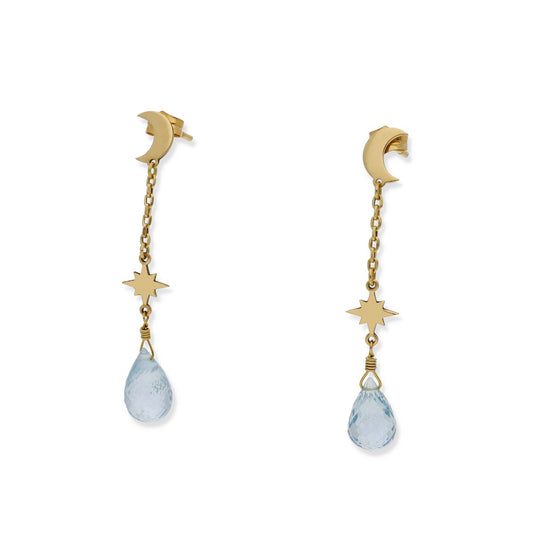 Pendientes Sera con Luna y Estrella en Oro de Ley 18K y Topacio Azul Facetado