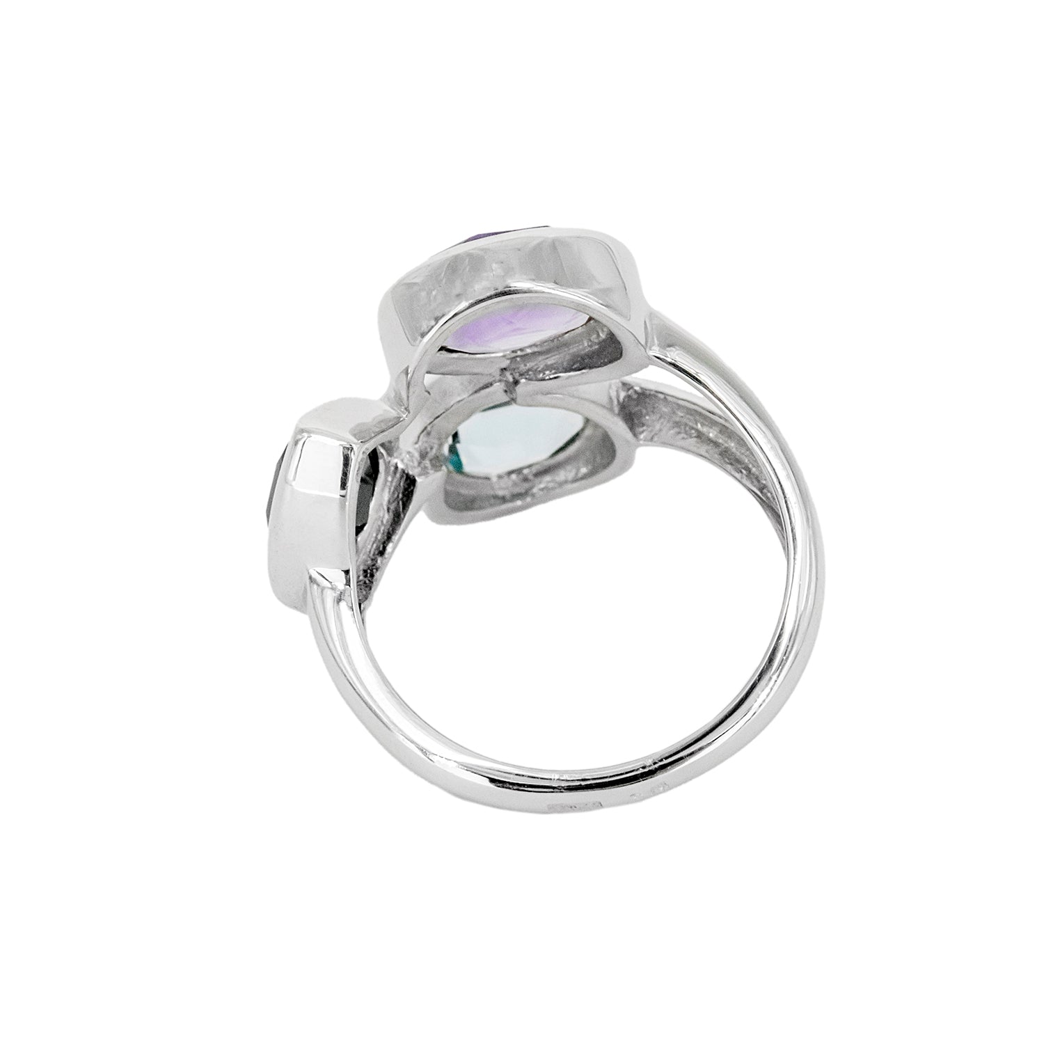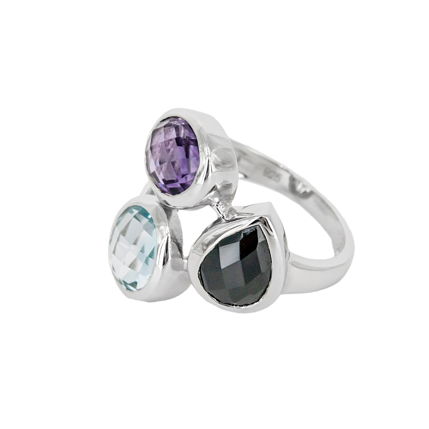 Anillo Atatu de Plata con Tres Piedras de Color – Azul, Lila y Negra