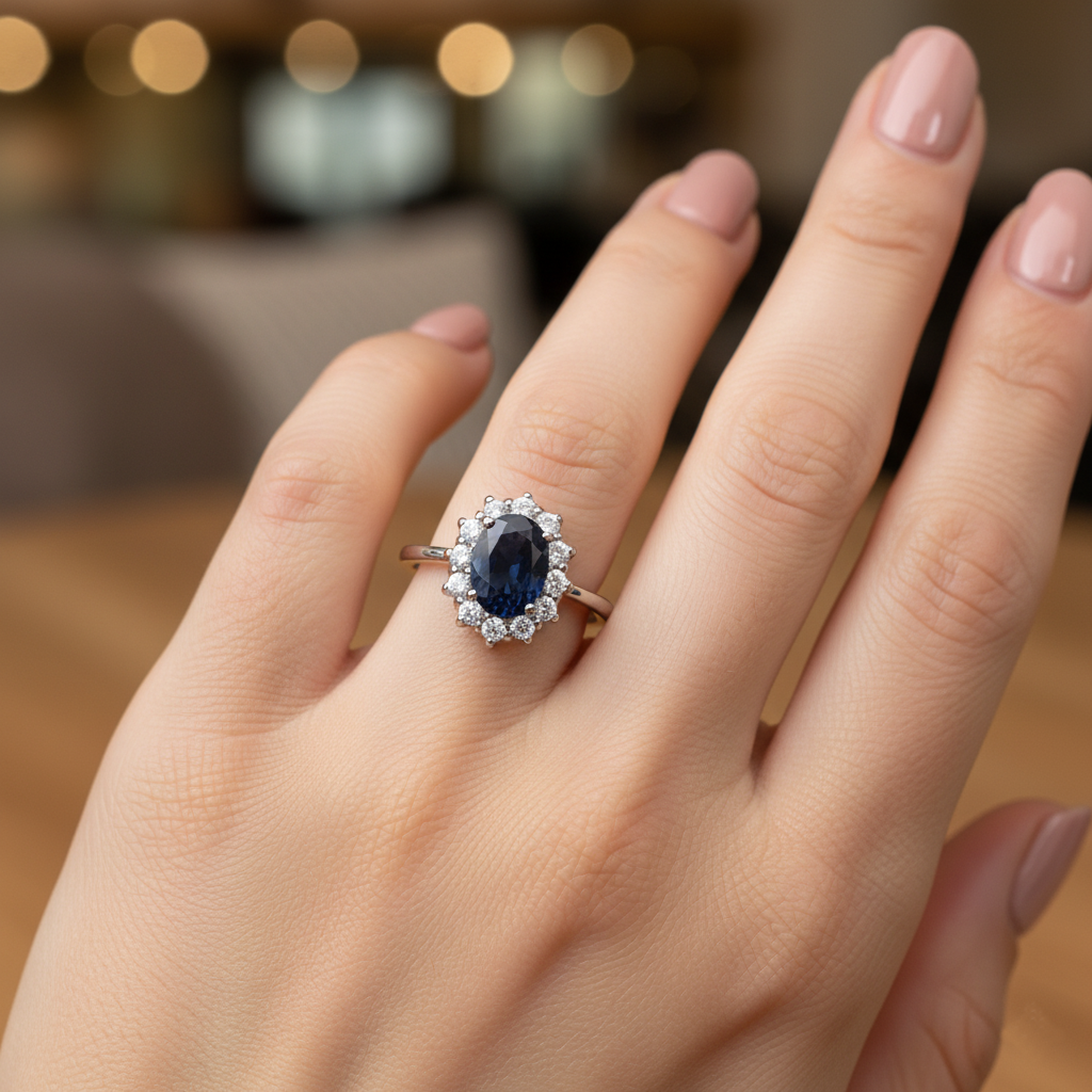 El anillo estilo Lady Di realizado en oro blanco de 18k con una orla de 12 diamantes talla brillante y un zafiro central talla oval de unos 1,25 ct. Su diseño clásico, inspirado en el icónico anillo de compromiso de la princesa Diana, se combina con un acabado moderno que lo hace resplandecer con elegancia y sofisticación.