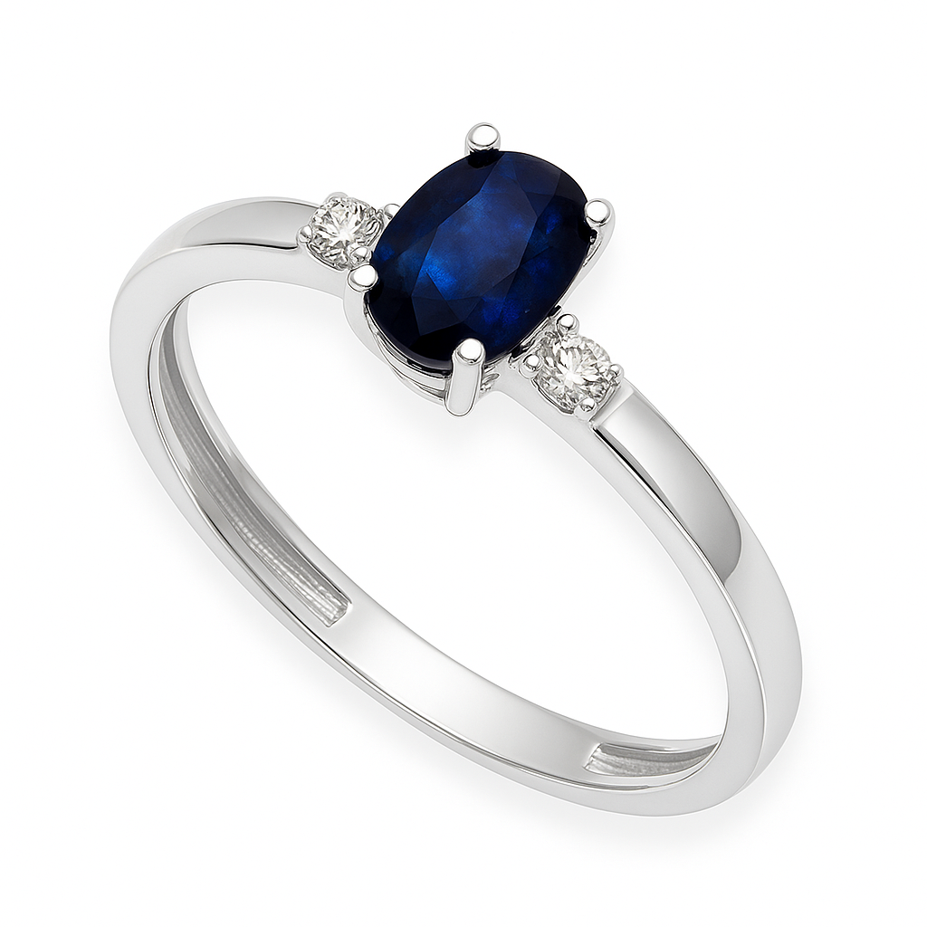 Esta sortija destaca por su precioso Zafiro central de 0.40 quilates en talla oval facetado, acompañado de 2 diamantes corte brillante con un total de 0.10 quilates.