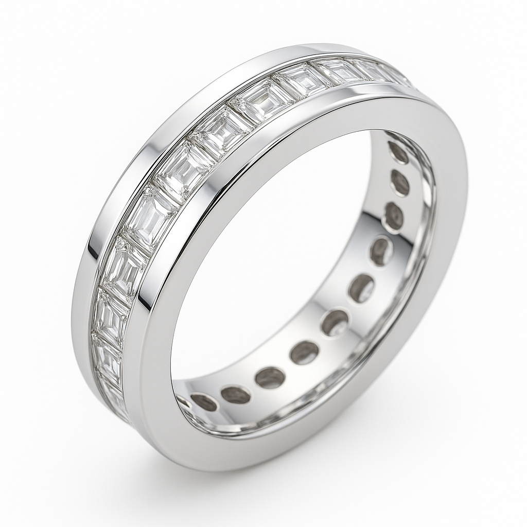 Cada detalle del anillo Violet está cuidado al máximo. Sus diamantes talla baguette recorren todo el anillo, generando un resplandor geométrico y refinado que lo convierte en un accesorio excepcional. Esta talla de diamante, reconocida por su elegancia y precisión, aporta un destello único que refleja la luz de manera sutil y sofisticada, elevando la joya a la categoría de pieza de colección.
