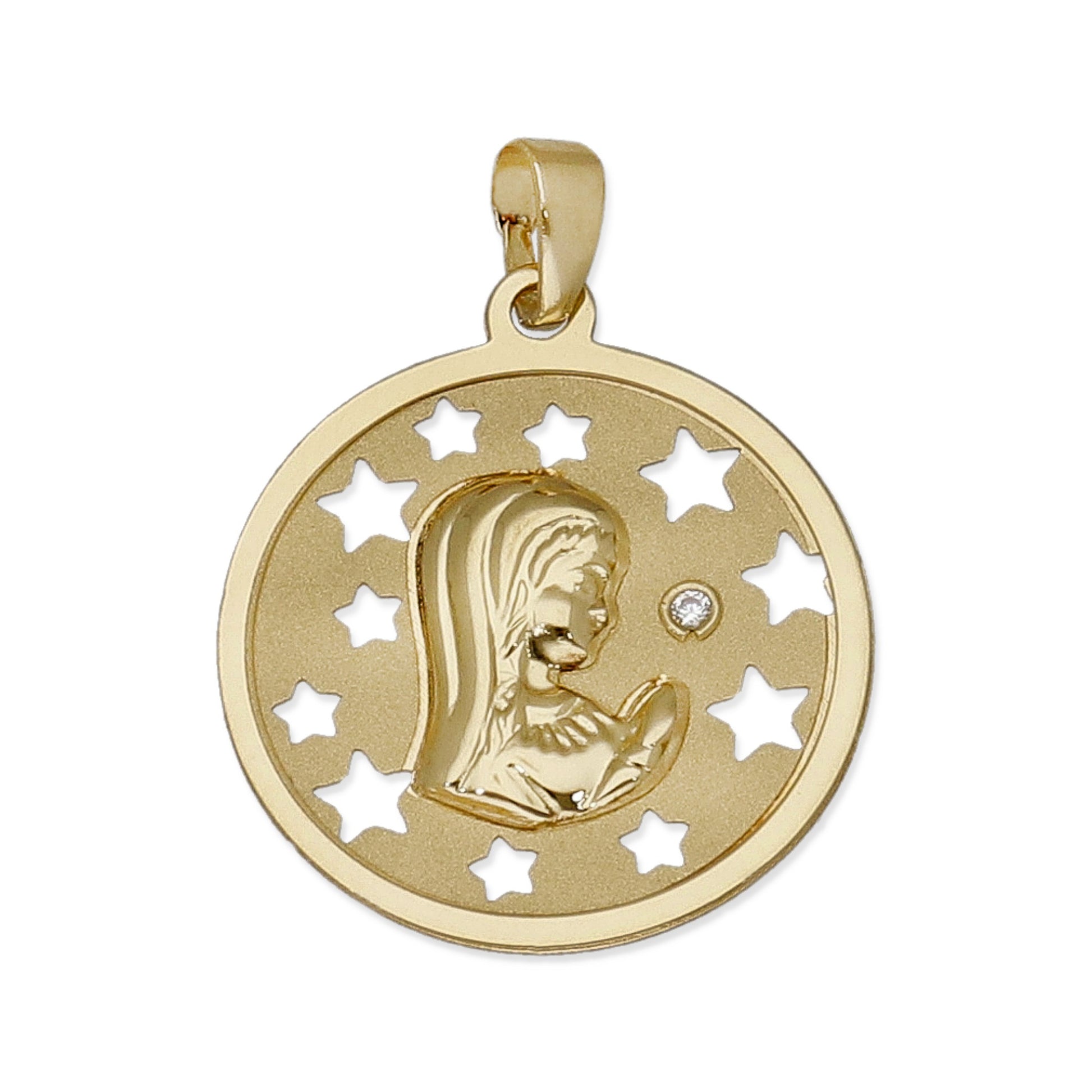 Medalla Virgen NIña en Oro 18K con Circonita y Estrellas Caladas