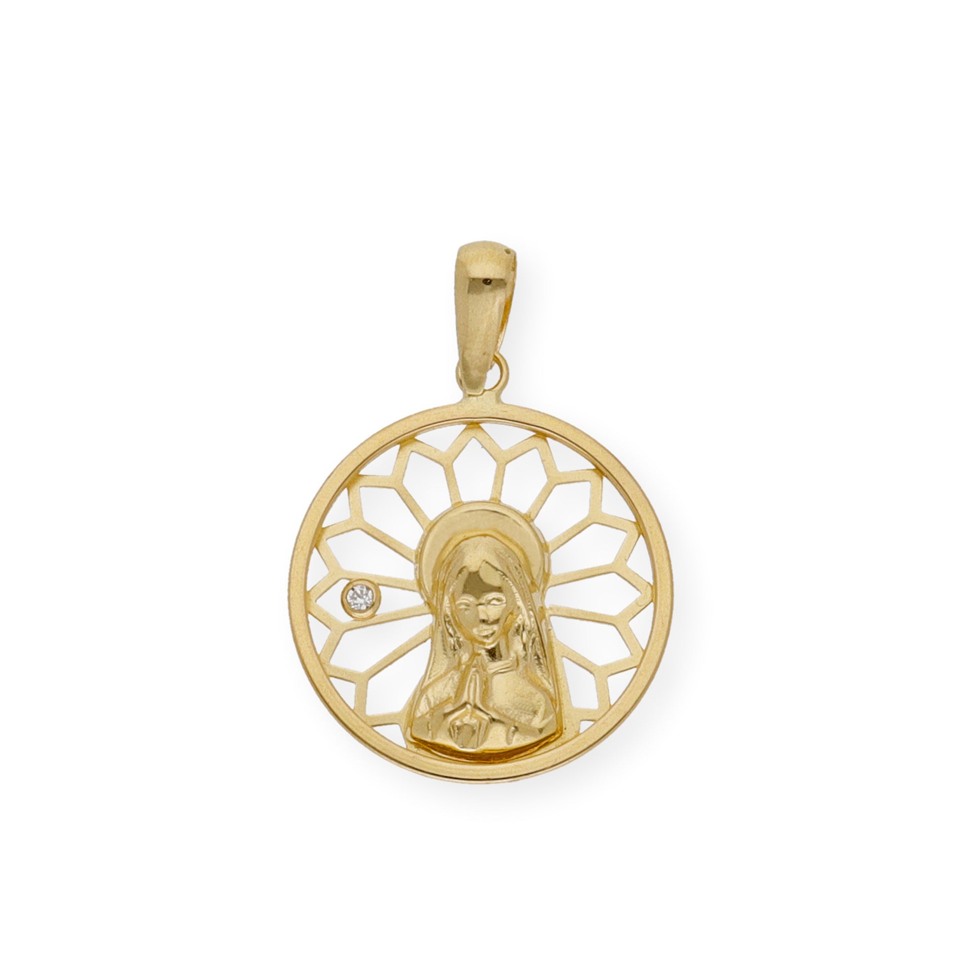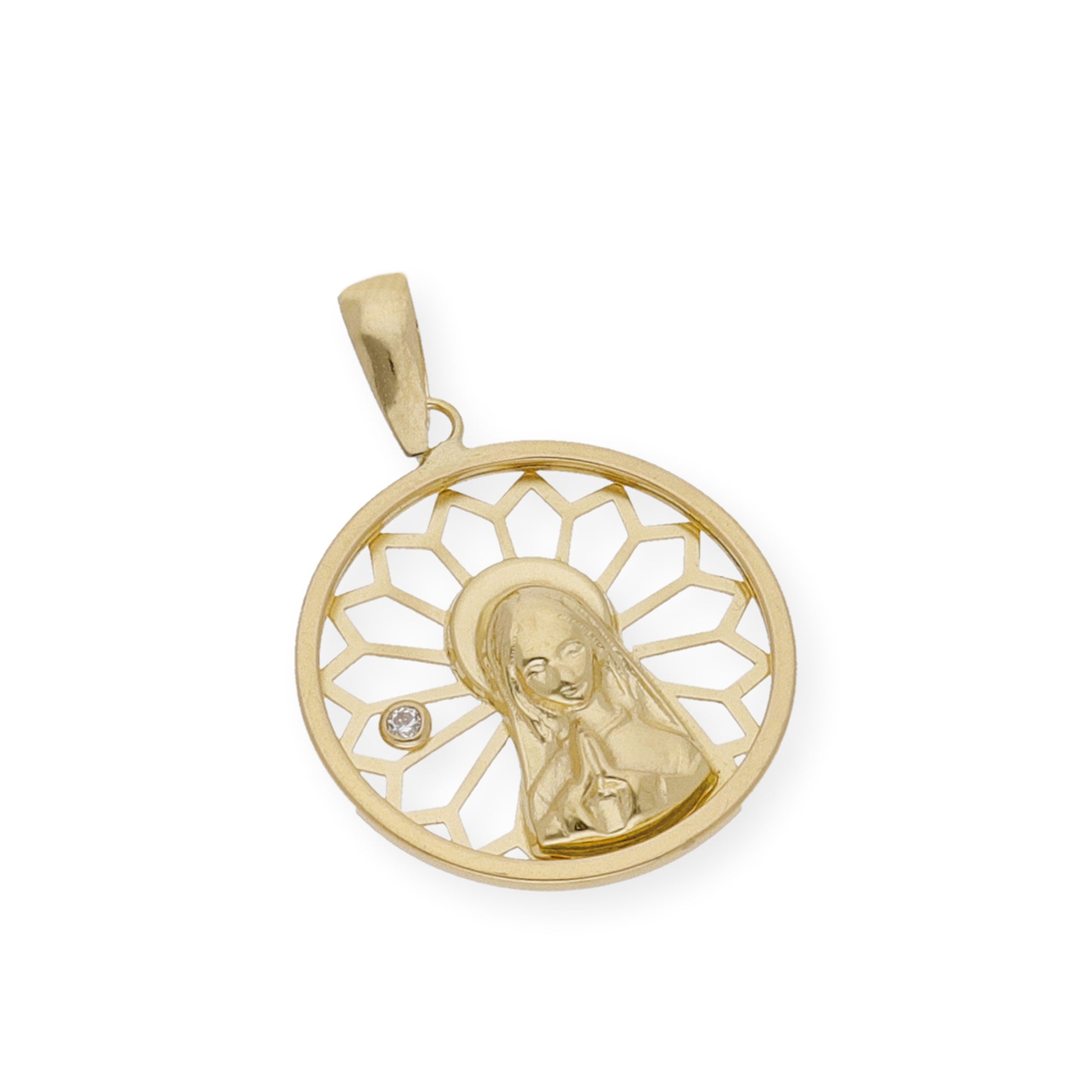 Elegante medalla calada de la Virgen Niña en oro de 18 quilates, con forma redonda y un delicado diseño que incorpora una brillante circonita.