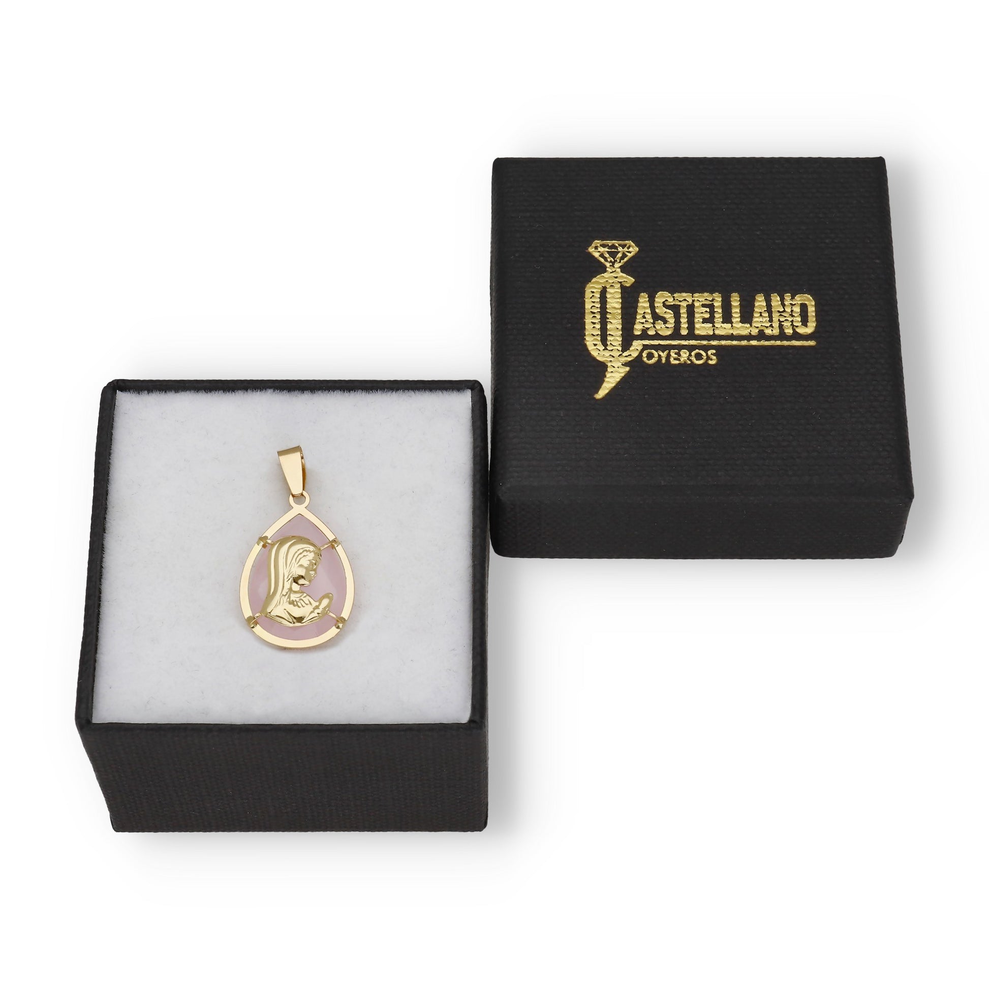 El oro de ley 18 quilates, con su brillo cálido y atemporal, se combina con una delicada piedra rosa, que añade un toque de dulzura y serenidad. Este contraste armonioso realza la imagen de la Virgen Niña, representando la inocencia y la fe en su máxima expresión. Su diseño artesanal garantiza una pieza exclusiva y con detalles únicos.