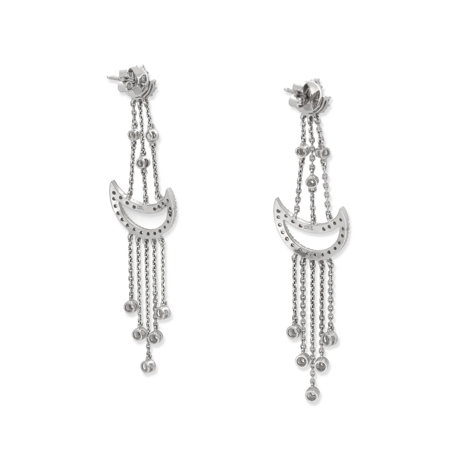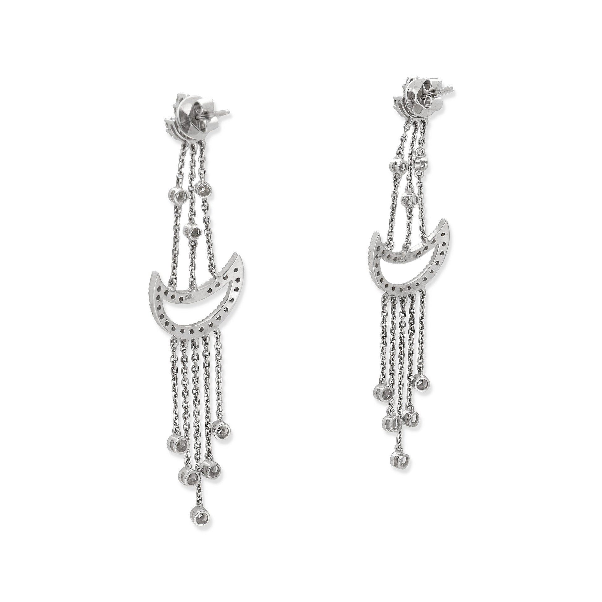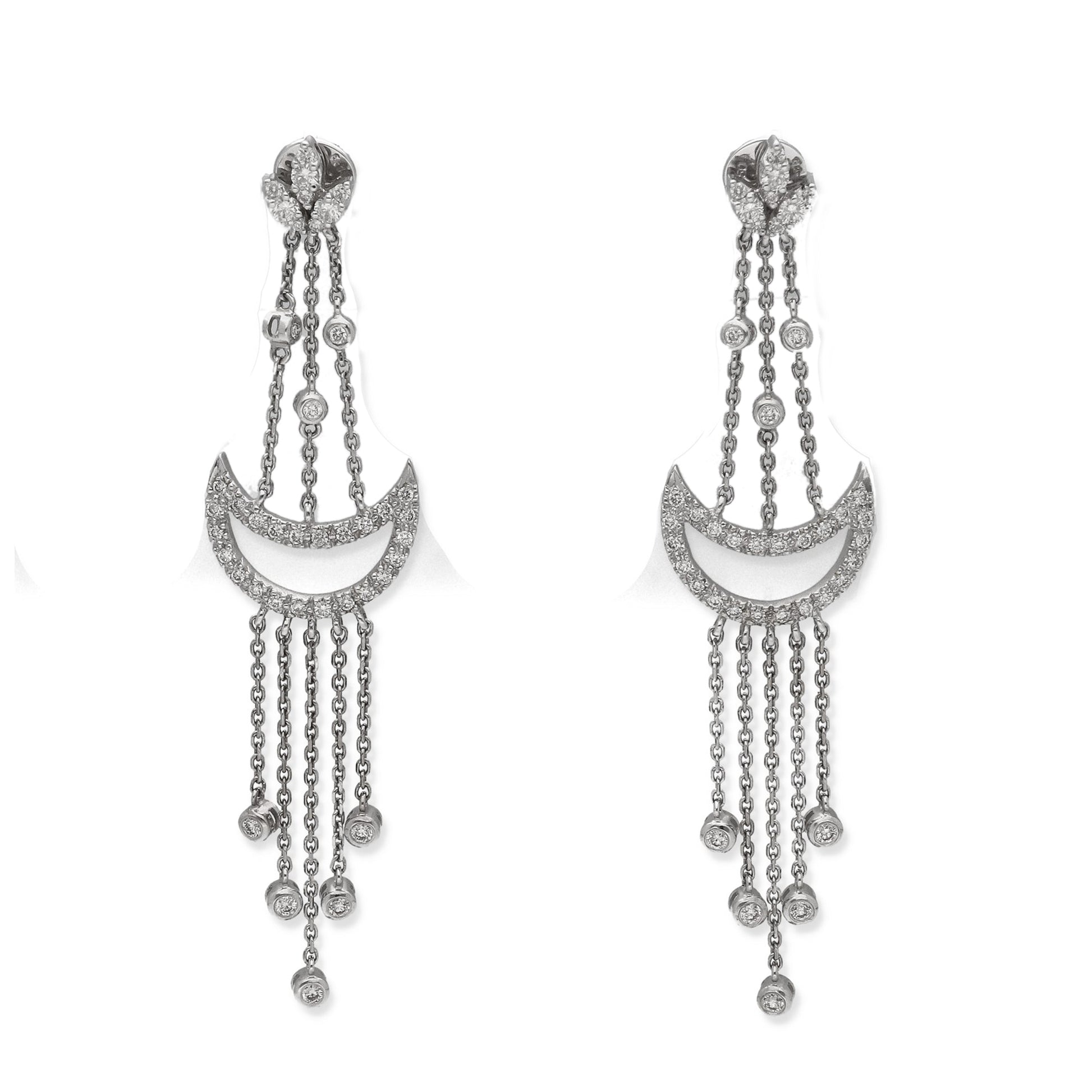 La parte superior, decorada con delicados diamantes talla brillante, da paso a una estructura en forma de media luna, símbolo de luz y renovación, completamente engastada en diamantes que irradian destellos sutiles y refinados. Desde ella, caen cadenas finas también adornadas con diamantes suspendidos, creando un efecto de caída luminosa y un movimiento hipnótico al compás del cuerpo.