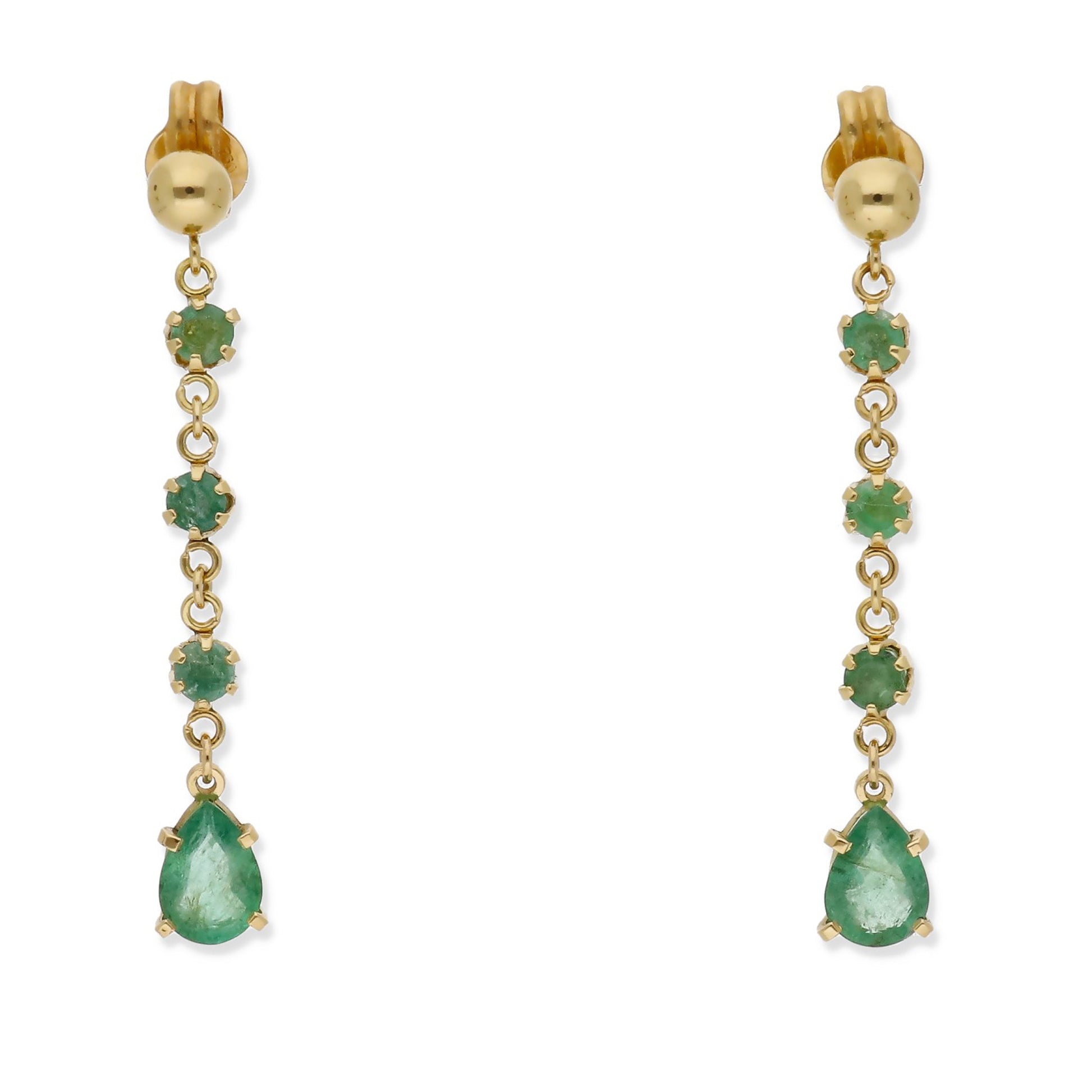 Destacando su belleza, los pendientes cuentan con dos esmeraldas talla pera, que deslumbran con su corte preciso y su intensidad de color verde. Además, están acentuados con seis esmeraldas talla redonda, sumando un total de 0,30ct, que aportan un brillo adicional y un toque de glamour a la pieza.