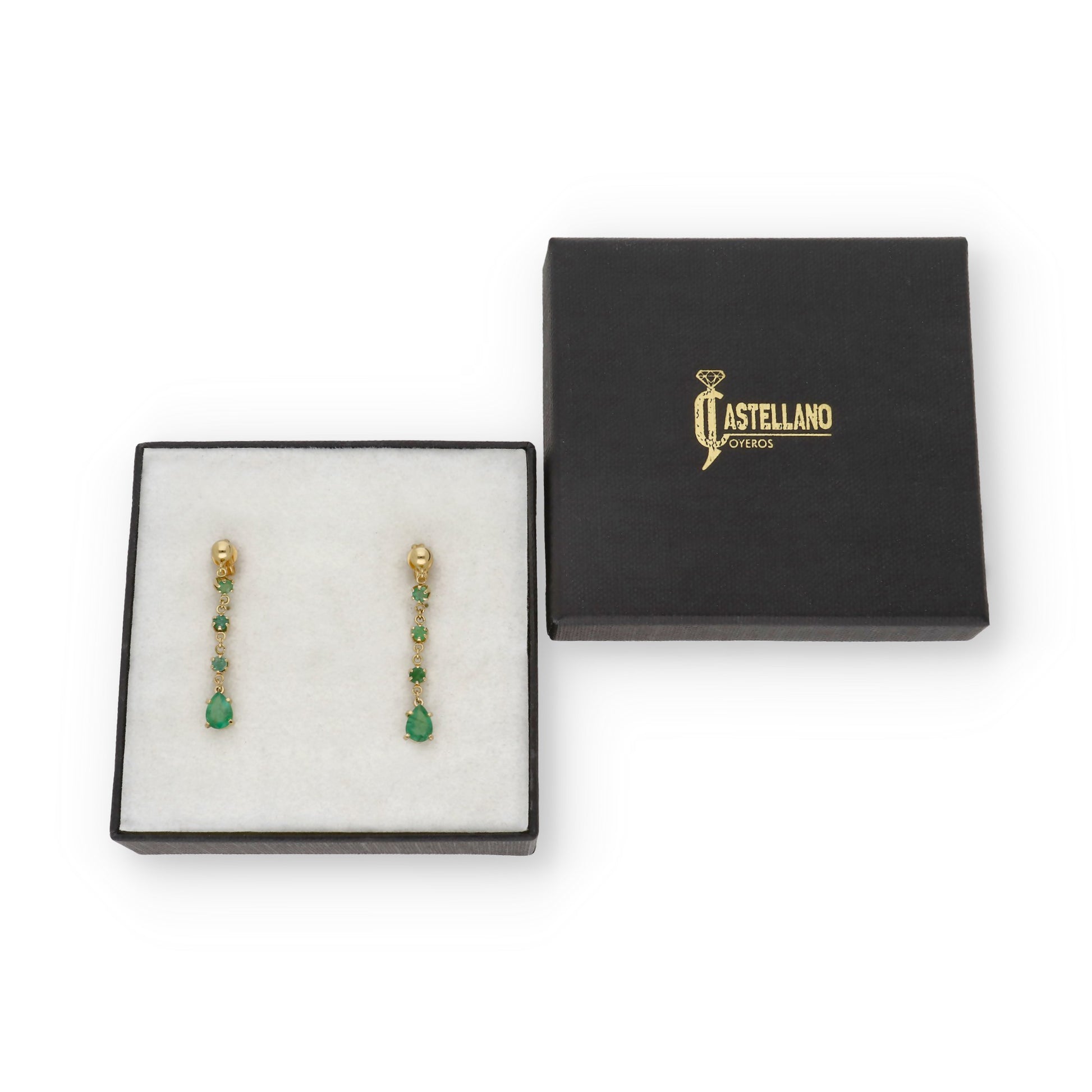 En Castellano Joyeros, nos enorgullece ofrecerte joyas de alta calidad y diseño exclusivo. Nuestros pendientes con diseño de colgantes en oro de ley 18k y esmeraldas talla pera y redonda son una muestra de nuestra dedicación a la excelencia y al detalle. ¡Haz una declaración de elegancia con estos pendientes impresionantes!