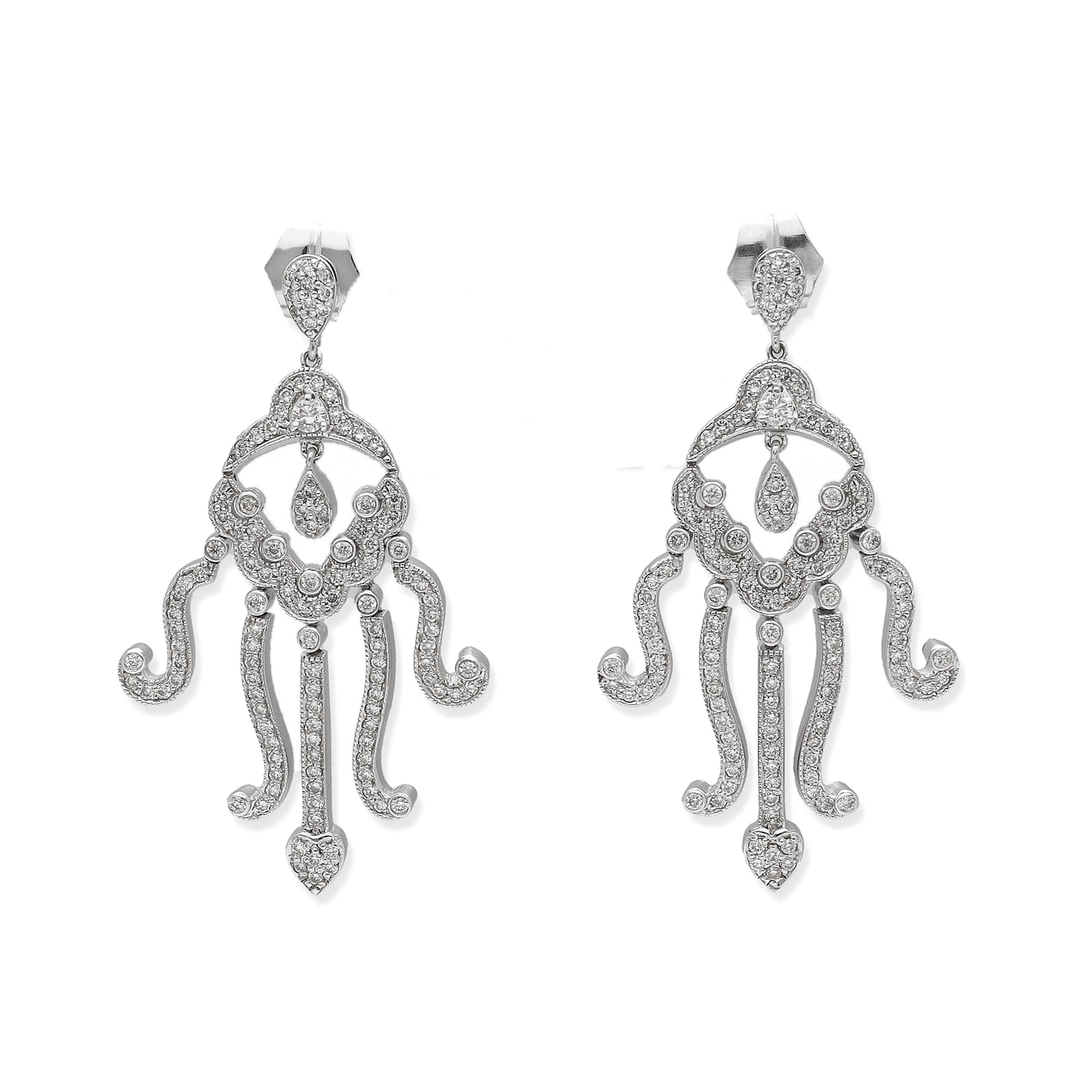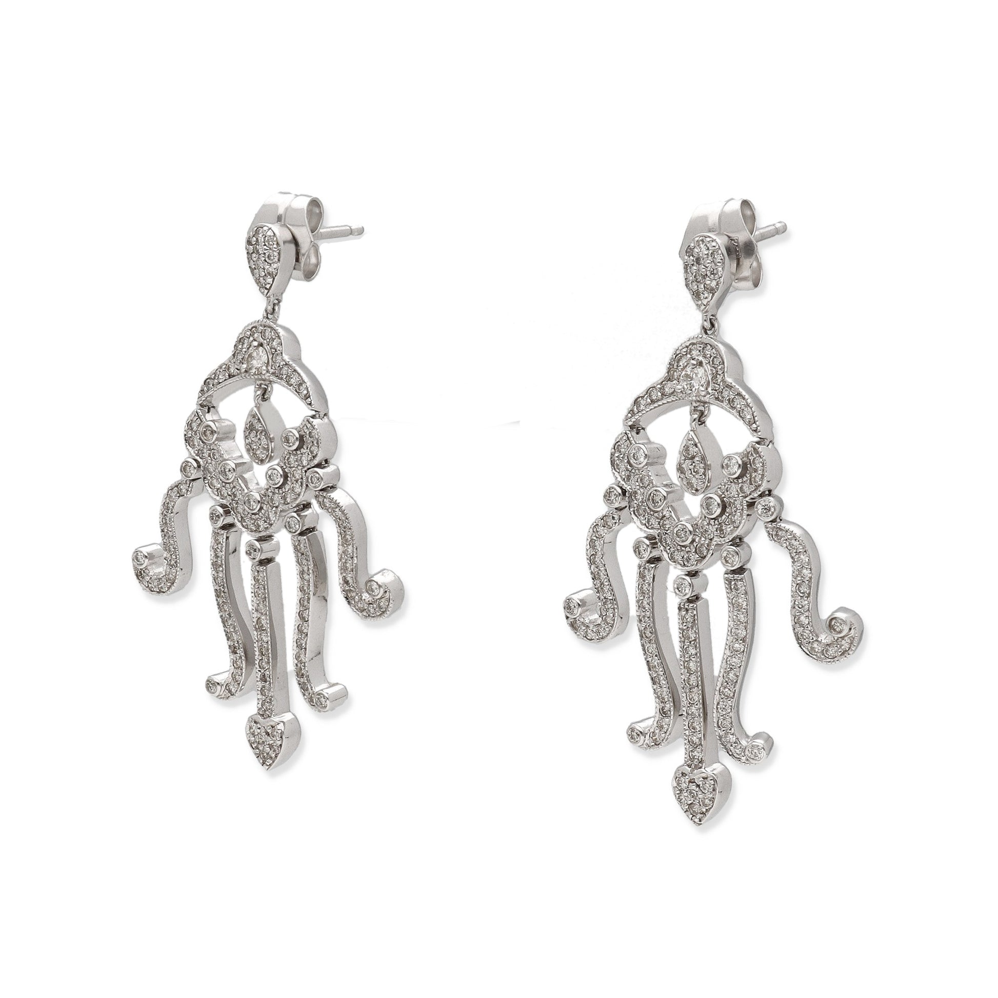El cuerpo del pendiente está completamente engastado con diamantes talla brillante, distribuidos con precisión artesanal para lograr un equilibrio perfecto entre brillo y estructura. Sus formas sinuosas y simétricas se combinan con detalles en lágrima y motivos geométricos, creando un juego de luces que resalta con cada movimiento.