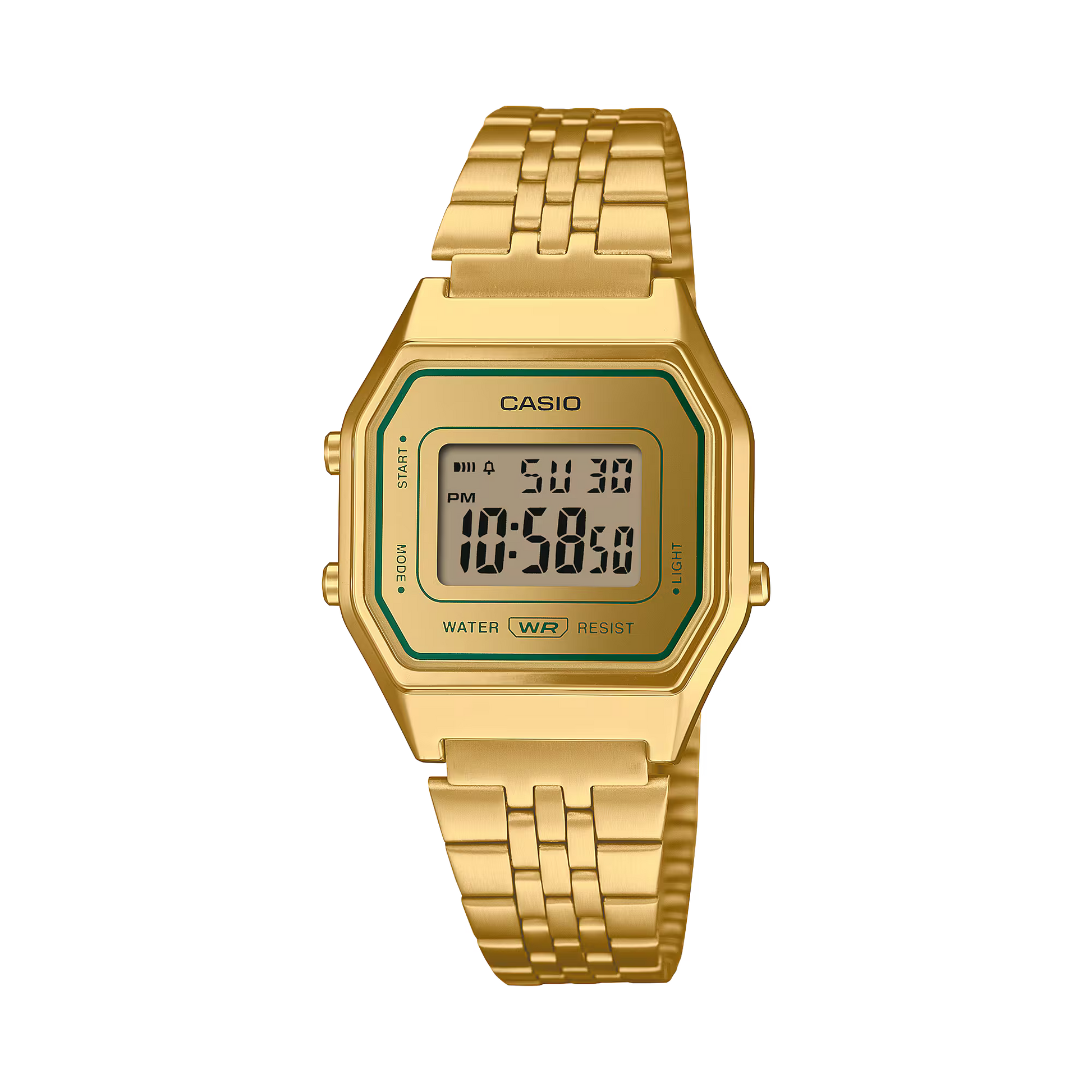 El icónico LA680 se renueva con una llamativa combinación de dorado y acentos verdes, ofreciendo un diseño unisex que equilibra lo atemporal con lo contemporáneo. Su pulsera de metal de varias filas tiene un elegante acabado mate, y el cristal con tratamiento de vapor aporta un brillo sofisticado que realza el conjunto.
