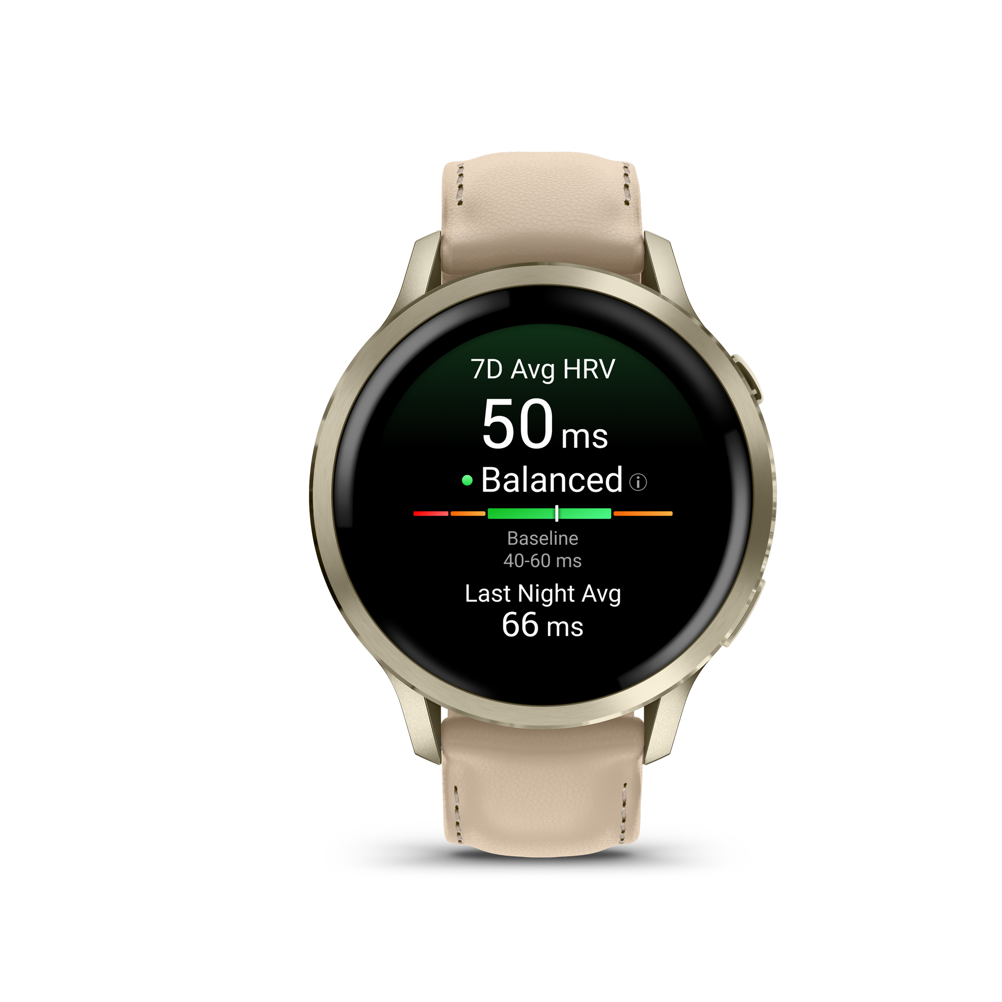 Reloj Garmin Venu® 4 - 41 mm Bisel Plateado con Correa de Cuero Beige 010-03013-03