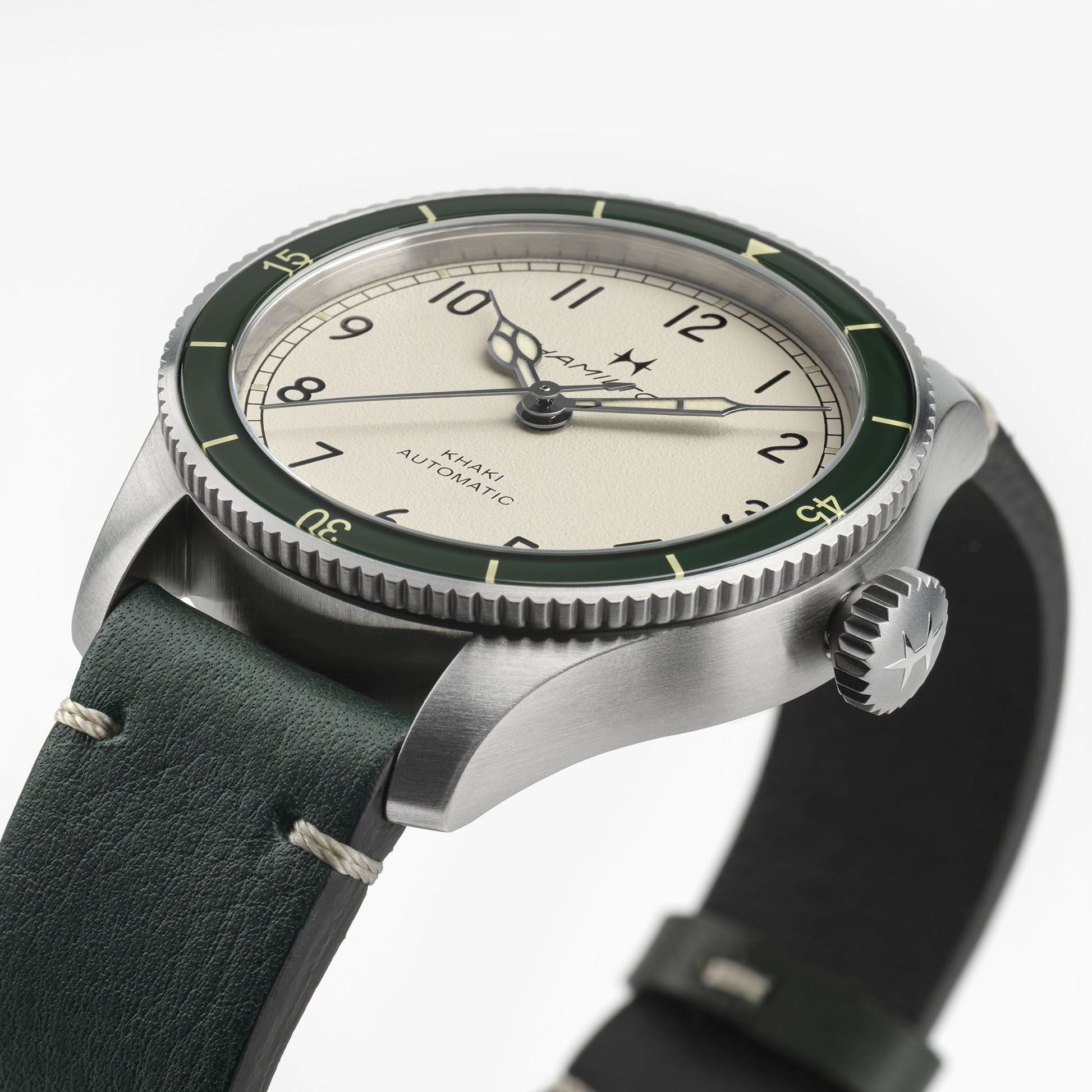 Con su distintivo encanto retro, el Khaki Pilot Pioneer Auto 38 mm continúa rindiendo homenaje al rico legado militar y de aviación de Hamilton. El modelo, que brilla en verde musgo con bisel giratorio a juego, está equipado con movimiento H-10 y reserva de marcha de 80 horas. Este reloj, dotado de esfera color blanco roto y correa de piel verde, nunca va a pasar de moda.