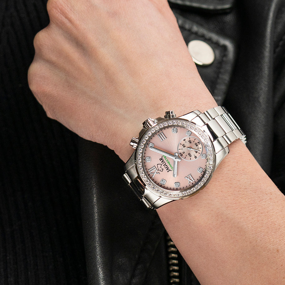 El modelo J980/2, de color Rosa, con esfera Rosa e índices de color Circonita, ofrece una visualización perfecta gracias a su cristal de Zafiro.