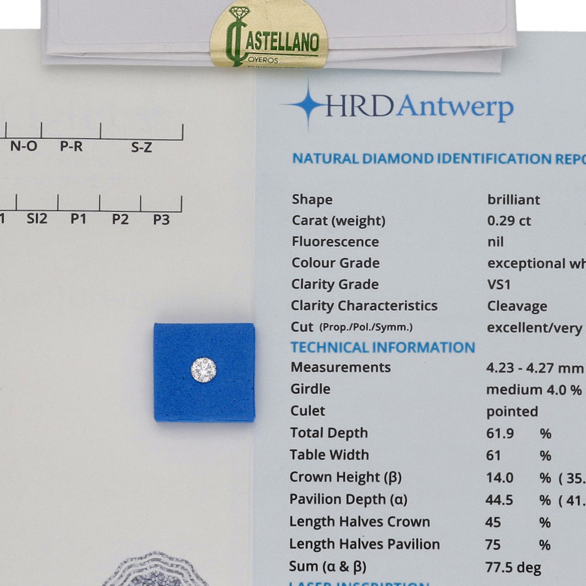 Diamante Natural Certificado talla brillante de 0,29 quilates, color E, y pureza VS1. Con certificado por el HRD.